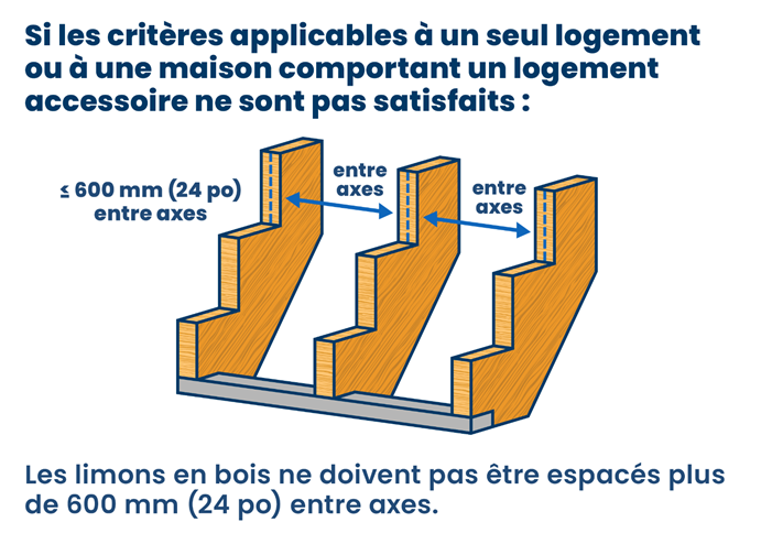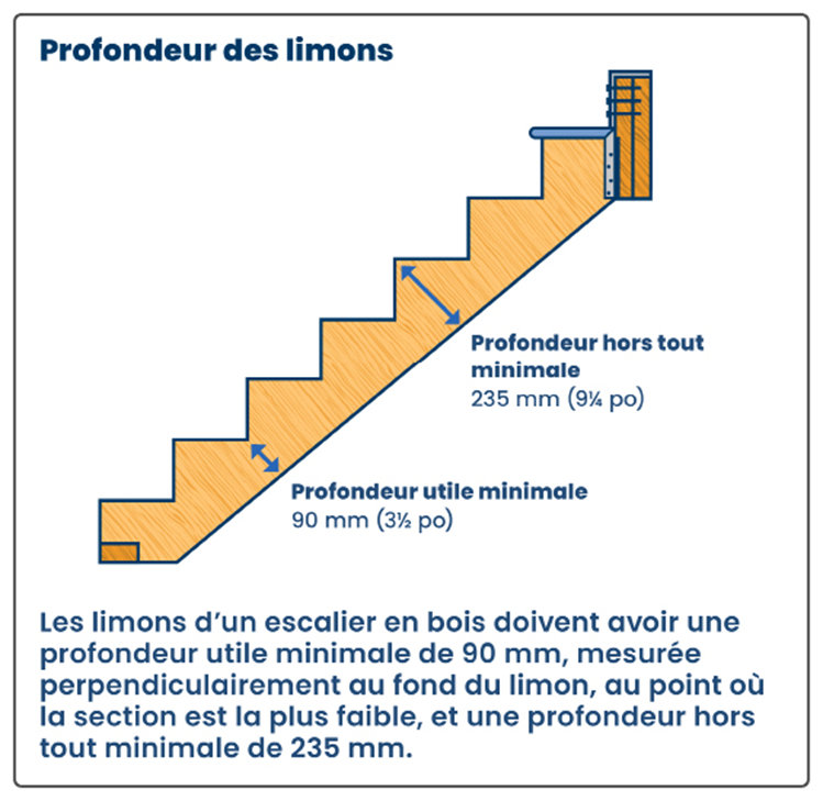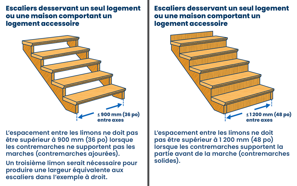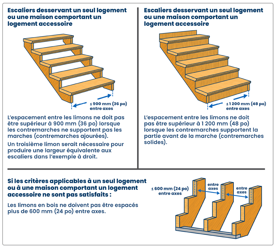 Il faut satisfaire à de nombreuses conditions pour assurer que les escaliers sont conformes au Code. Les diagrammes qui suivent démontrent les critères précis qui s’appliquent aux escaliers en bois.