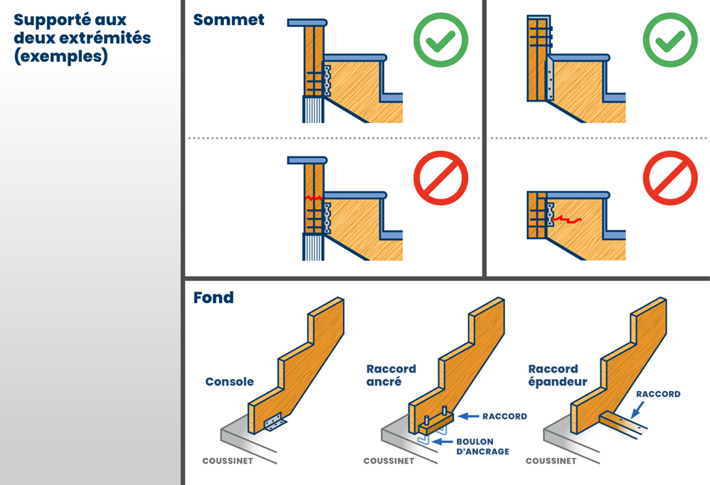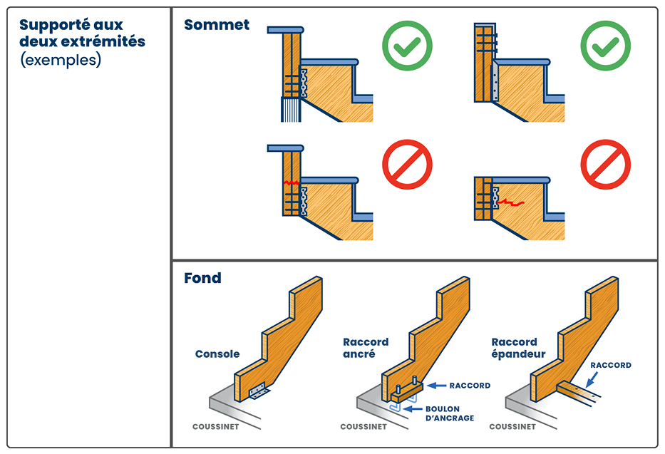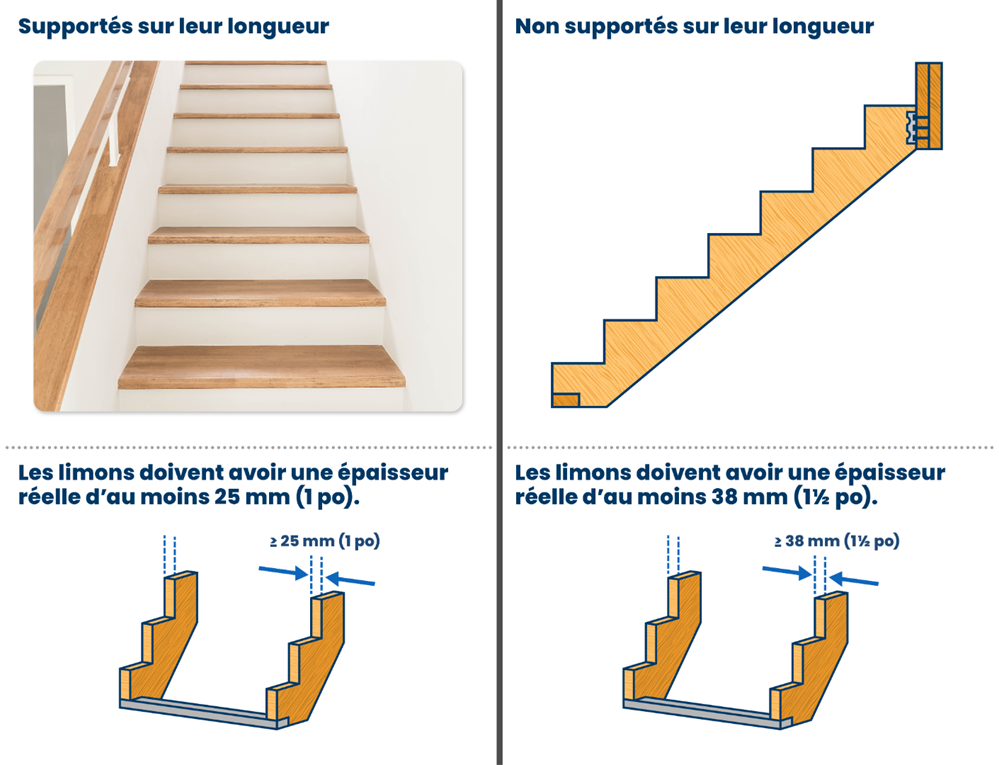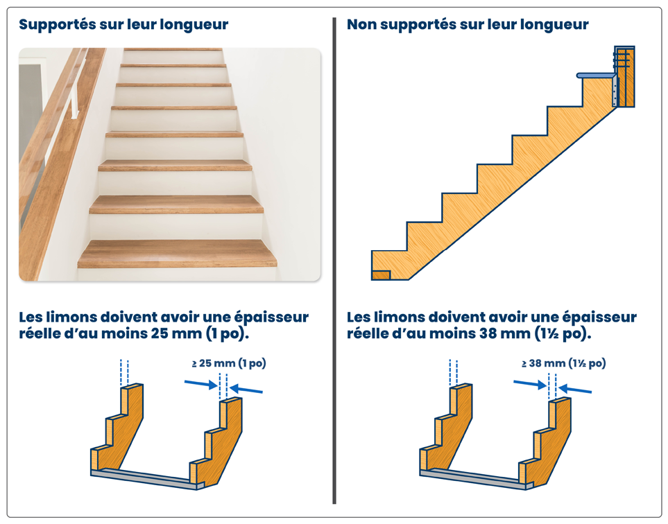 Supporté – Le limon doit être supporté aux deux extrémités. Le fond du limon doit reposer sur un plancher, un palier ou une dalle, ou être attaché à ce dernier. Au sommet, il devrait reposer sur une lambourde attachée au plancher de séparation ou au palier. Un crochet fabriqué serait aussi acceptable.