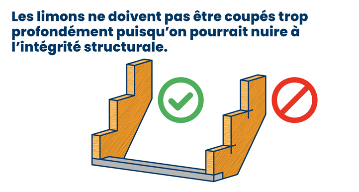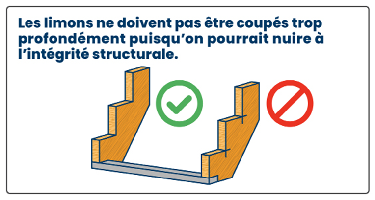 Assujetti – Le limon doit résister à la rotation (particulièrement important dans le cas d’escaliers comportant des contremarches ajourées). On peut aussi utiliser des cales entre les limons pour empêcher tout déplacement.